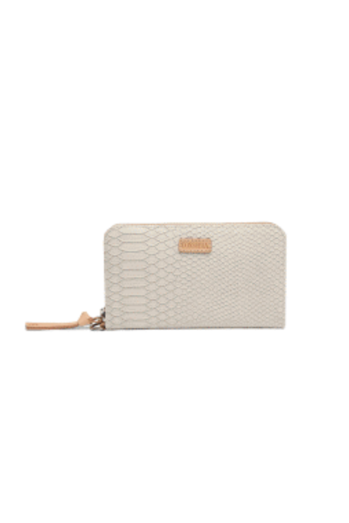 Function and versatility in the palm of your hand. Our Essential Wallet is a streamlined, large-capacity wallet with plenty of room for cards, cash, and receipts — plus a zippered center compartment for coins and keepsakes. We added a D-ring so you can easily clip it to any Consuela wristlet strap or anchor onto an inside lanyard for added security.