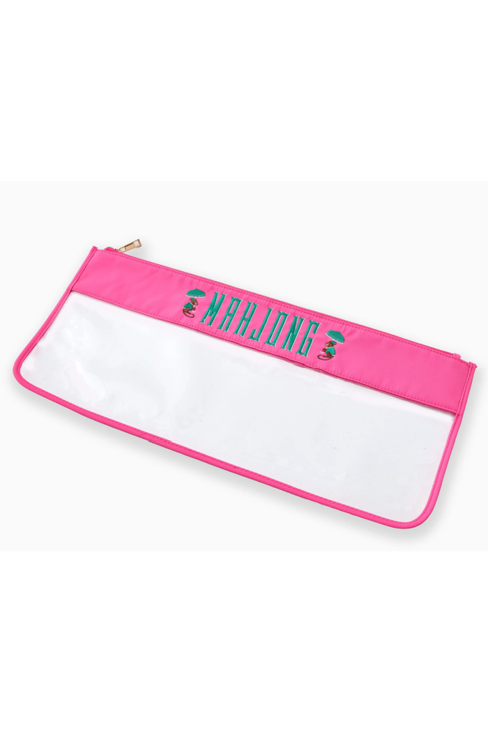 A clear zip pouch with bright pink trim, perfect for stashing game pieces or travel essentials. The Pink Monkey Mahjong Bag pairs a transparent PVC body with nylon binding and a top zipper for easy access. This playful accessory is styled by OH MY MAHJONG and reads as an off-duty, on-the-town novelty pouch.