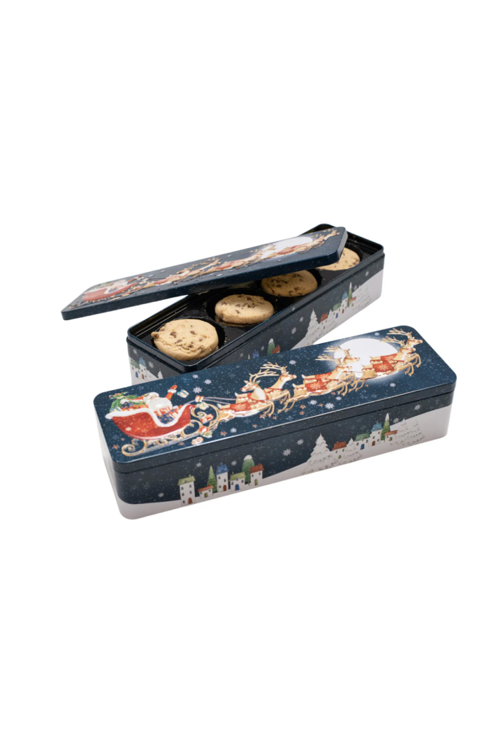 A heavily embossed gift tin with a flying Santa design, filled with classic milk chocolate chip biscuits.