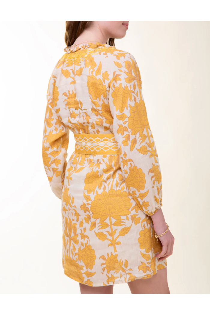 Analisa is a golden dream great to transition into fall. Crafted from lightweight linen, this dress features a ruffle collar, splitneck with embroidered detail, and billowing long sleeves for a flowy, feminine silhouette. With side seam pockets and an embroidered belt to cinch the waist, she's the perfect balance of chic and ease. This sundress is your new go-to for everything from casual outings to special celebrations.