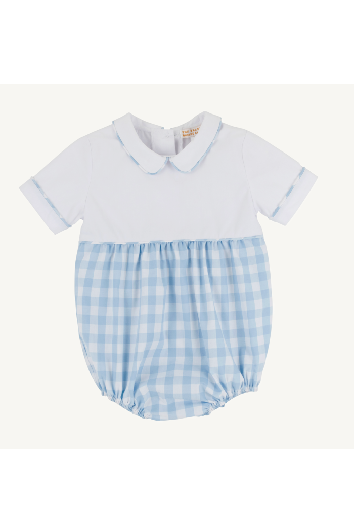 A classic bubble one-piece in soft blue gingham with a crisp white bodice and Peter Pan collar. The Bradford Bubble Barrington Blue Check One-Piece has short sleeves and elasticized leg openings for an easy, comfortable fit. Made by The Beaufort Bonnet Company, it pairs heirloom styling with simple everyday wearability for baby.