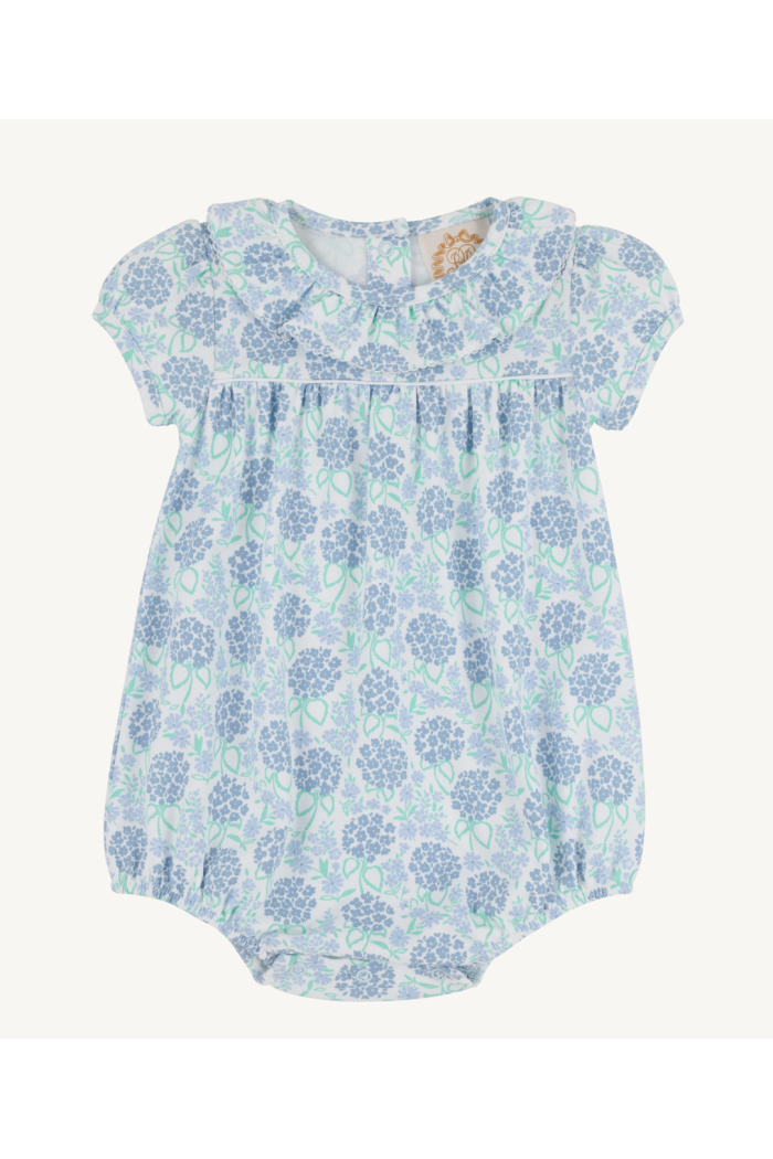 Sweet floral bubble with a ruffled collar and gathered bodice for a classic baby look. The Ramona Ruffle Bubble One-Piece is crafted from soft Pima cotton and features cap sleeves and elasticized leg openings for easy changing. Lightweight and breathable, it layers well for warm-weather days or family photos. This style is offered by The Beaufort Bonnet Company and reads like a timeless heirloom piece.