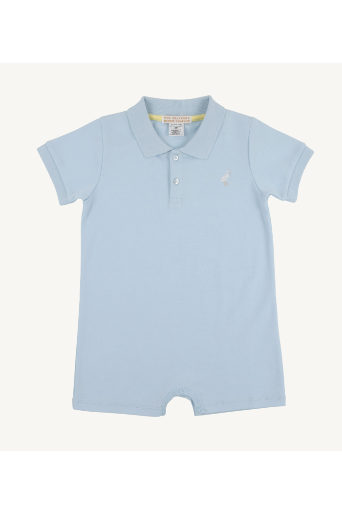 A soft polo-style romper with a classic collar and short sleeves, ideal for warm-weather wear. The Sir Proper Romper from The Beaufort Bonnet Company is crafted in a cotton piqué knit with a small embroidered motif at the chest and snap closures at the leg for easy changes. Its straight, relaxed silhouette and pale blue hue make it a timeless choice for everyday play and special occasions.