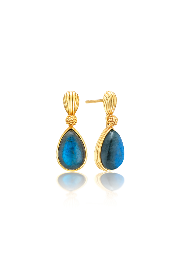 These day-to-night earrings are equally dramatic and demure, with luminous drops of blue labradorite gemstones that delicately dance around your face. Ready to take you from the boardroom to the ballroom.