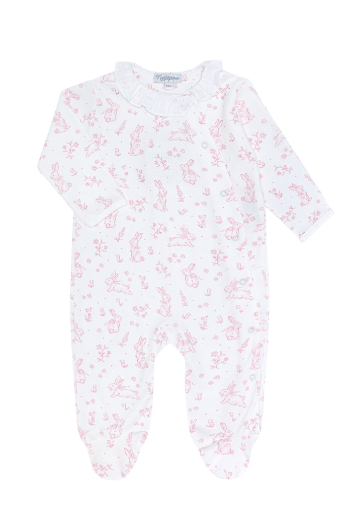 This Pink Bunny Toile Crossover Footie is a footed one-piece with an allover pink bunny toile print and a delicate ruffled collar. The Nellapima sleeper features a crossover snap front for easy dressing and long sleeves for added warmth. Made from a soft knit fabric, it’s designed for comfy sleep and sweet daytime lounging for baby girls.