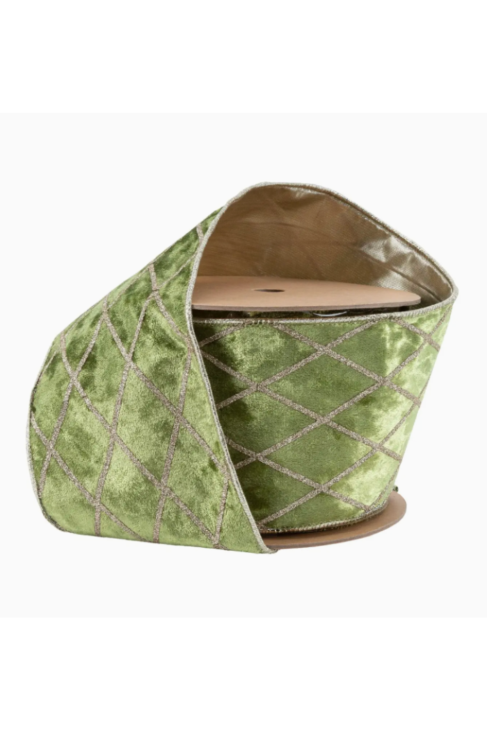 * Elegant 4" willow green crushed velvet ribbon with a shimmering gold glitter diamond pattern for a luxurious touch.