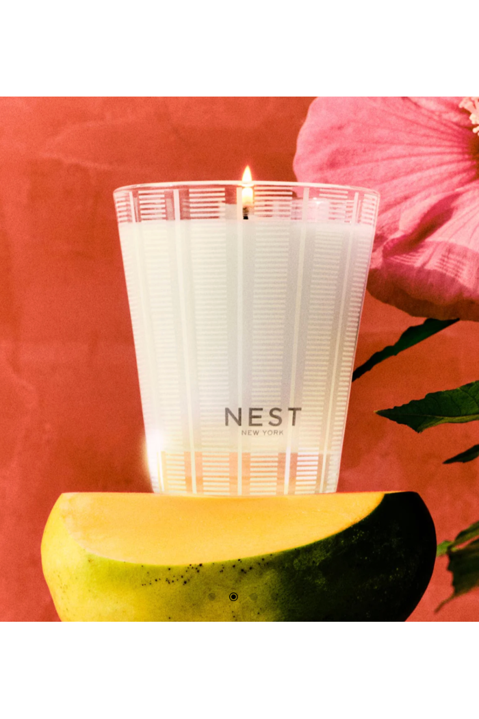 Something Tropical Classic Candle is a scented jar candle presented in a patterned glass vessel with clean white wax. Nest Fragrances layers bright tropical notes in a modern, fluted glass silhouette that reads decorative on a shelf or table. Light it to add a fruity, island-inspired aroma to living rooms, bathrooms, or to give as a thoughtful gift.