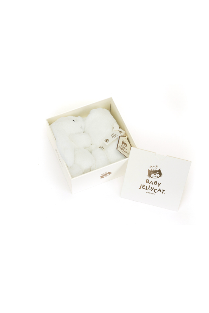 Bashful Luxe Bunny Luna Soother offers the perfect comfort in luxuriously soft white fur. Little ones can cuddle up with the blanket or the tiny Bashful Luxe Bunny Luna holding on to the corner for the most joyful of dreams. This soother is tied with a grosgrain printed ribbon and presented in an elegant Jellycat gift box with gift card and envelope. An indulgent gift for a new arrival.