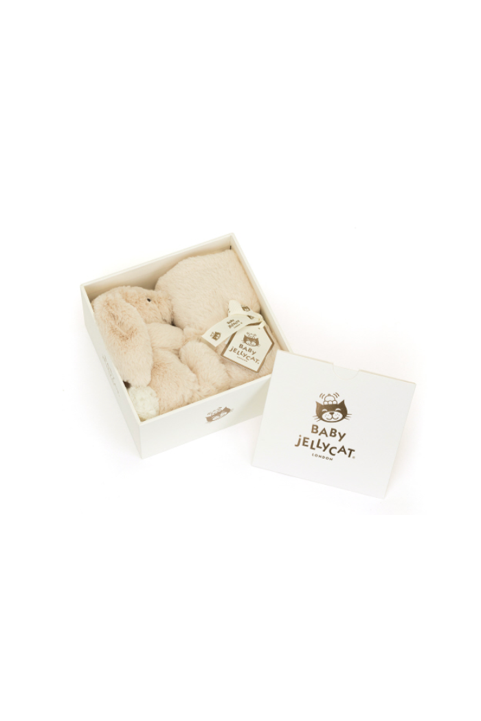 Bashful Luxe Bunny Willow Soother offers the perfect comfort in luxuriously soft biscuit-gold fur. Little ones can cuddle up with the blanket or the tiny Bashful Luxe Bunny Willow holding on to the corner for the most joyful of dreams. This soother is tied with a grosgrain printed ribbon and presented in an elegant Jellycat gift box with gift card and envelope. An indulgent gift for a new arrival.