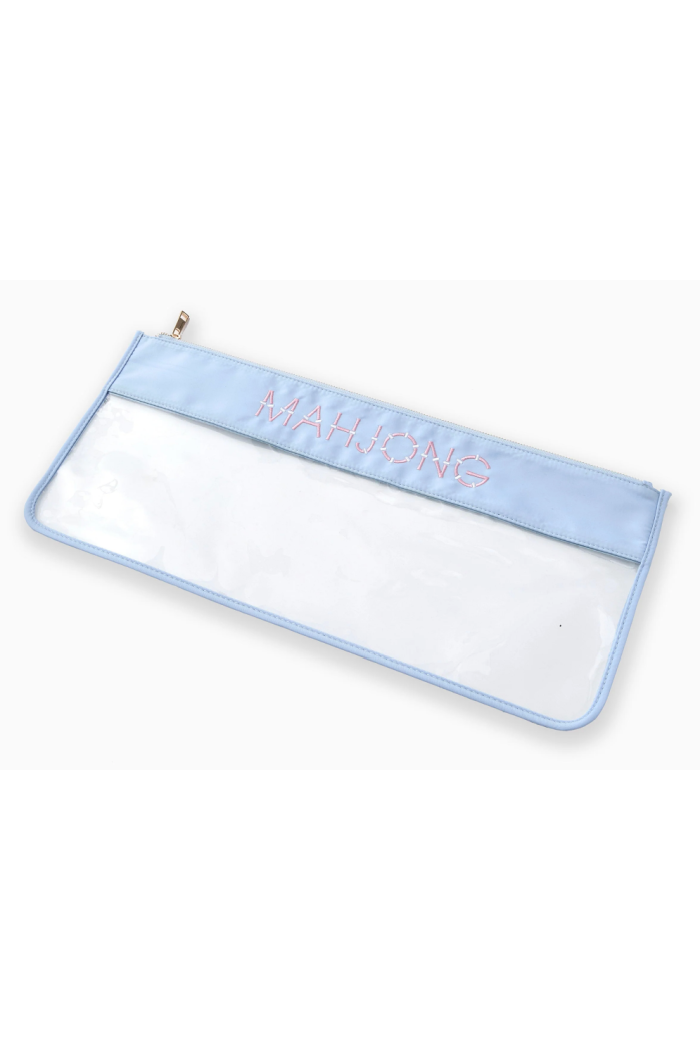A clear zip pouch detailed with light blue trim and embroidered MAHJONG lettering, perfect for keeping small essentials organized. The Light Blue Bamboo Mahjong Bag pairs a transparent vinyl body with a soft-trim top for an easy, modern look. Designed by OH MY MAHJONG, this piece is compact enough for travel or everyday carry and wipes clean for low-maintenance use. Keep cosmetics, cards, or game pieces visible and protected inside the slim silhouette.