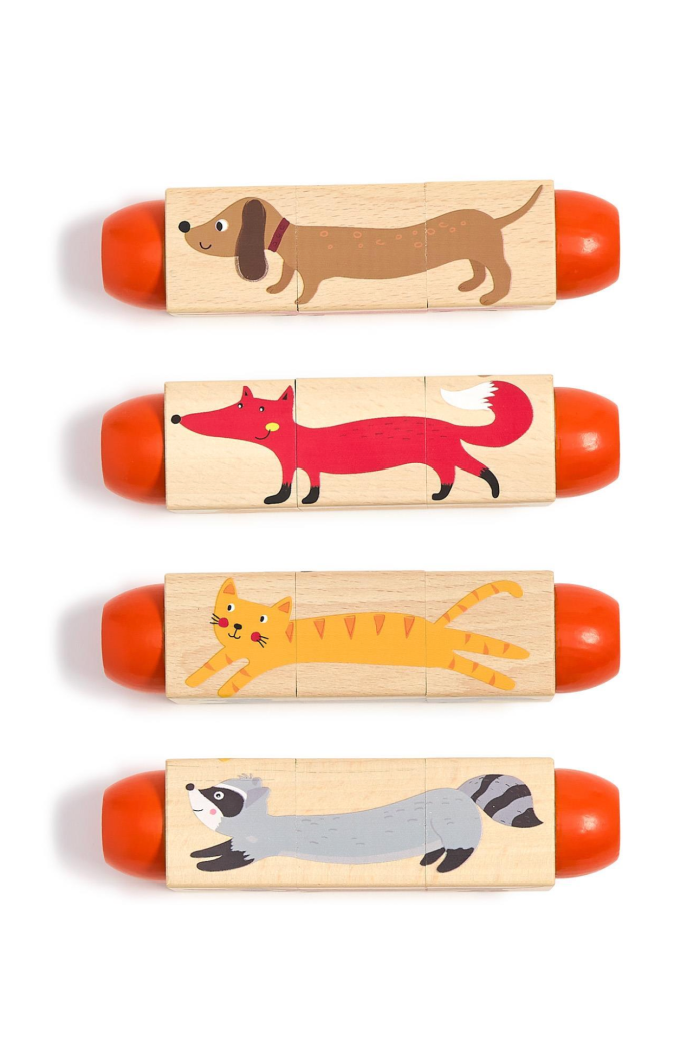 The Wooden Twist Block Puzzle Game is a set of four wooden sliding block puzzles that make animal faces when aligned. Each chunky wooden piece features bright painted ends and simple, kid-friendly artwork for hands-on play. This puzzle is ideal for early learning and fine motor practice, and it arrives from the brand Two's Company. The sturdy wooden construction makes it durable for repeated play sessions.