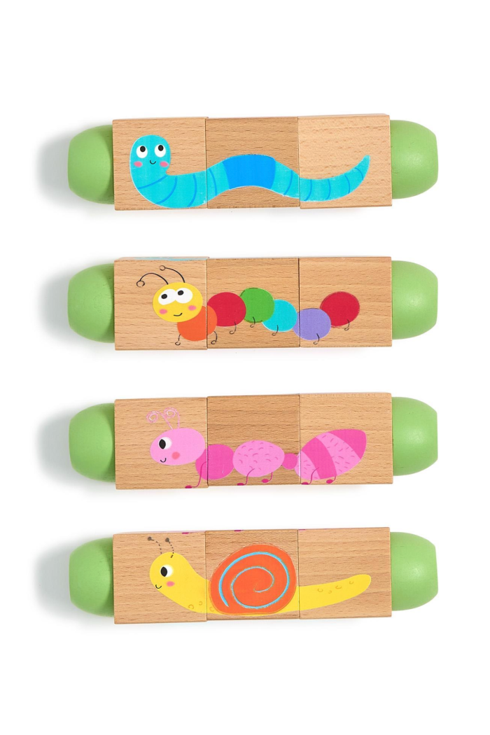 Sturdy wooden construction for long-lasting playAssorted 2 designs: garden critters and animalsColorful animal illustrations on each block sideMix and match pieces to create silly, new animalsRecommended for ages 18M and up