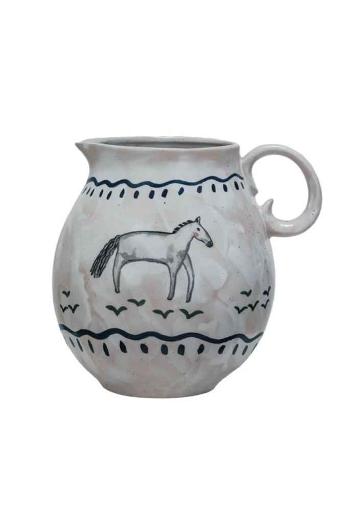 Handpainted Stoneware Pitcher with Horse, 2 1/2 Quart