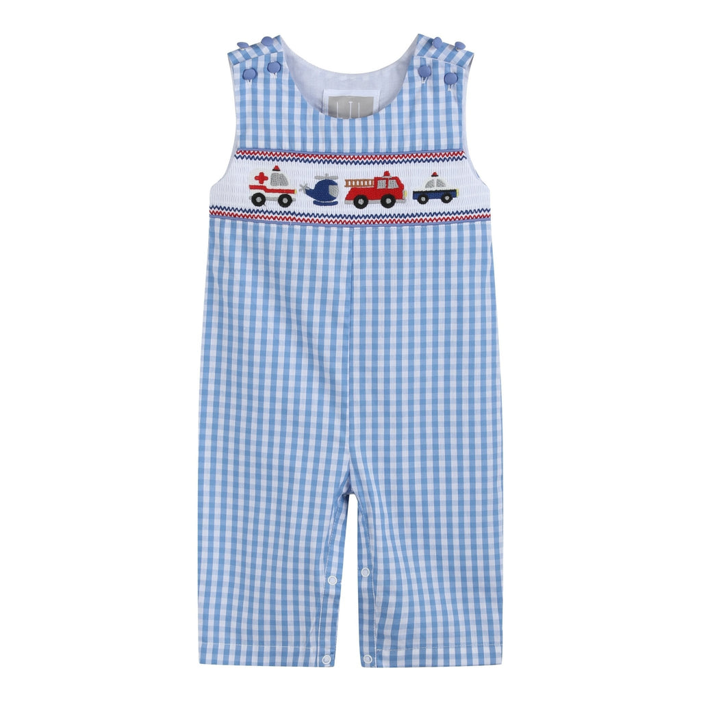 Blue Gingham Emergency Vehicles Smocked Overalls