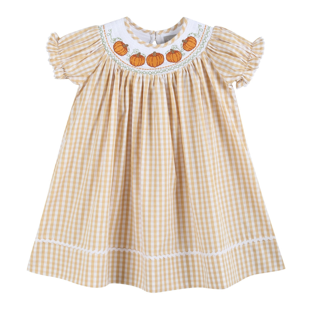 Light Brown Gingham Pumpkin Vine Smocked Bishop Dress