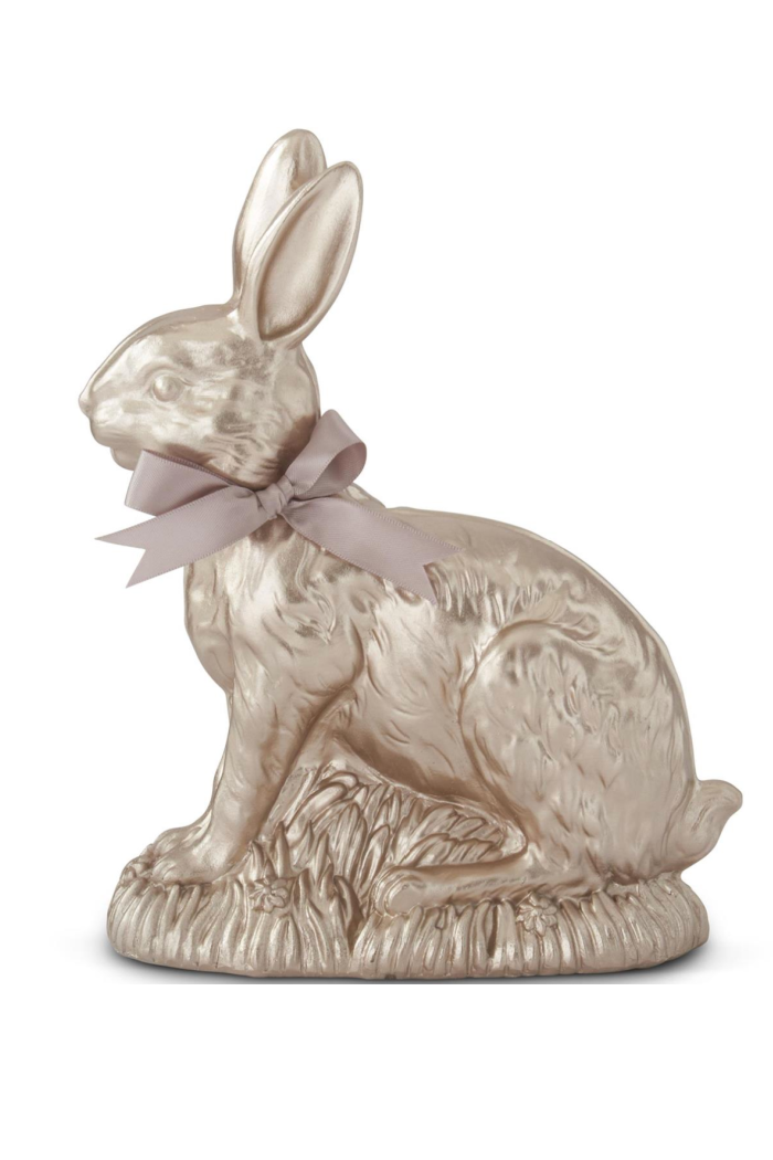 A sculptural gold rabbit accent with a soft ribbon bow, sized at approximately 9 inches tall. The 9" Gold Bunny with Bow adds a whimsical, upscale touch to mantels, shelves, or seasonal displays. Its metallic finish and molded detailing catch the light for subtle shimmer and texture. This decorative object is from K&K Interiors and works well as a gift or elegant table accent.