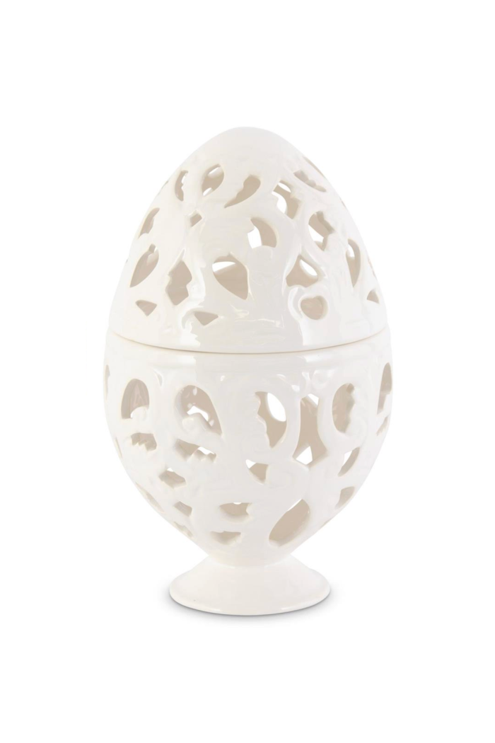 This 9.5" Cream Scroll Cutout Egg is a ceramic decorative object with an open scroll cutout pattern and a removable top. K&K Interiors finished it in a glossy cream glaze and set it on a small pedestal base for tabletop or mantel display. Use it alone as a sculptural accent or group with other ceramics to add light and texture to a living room or entryway.