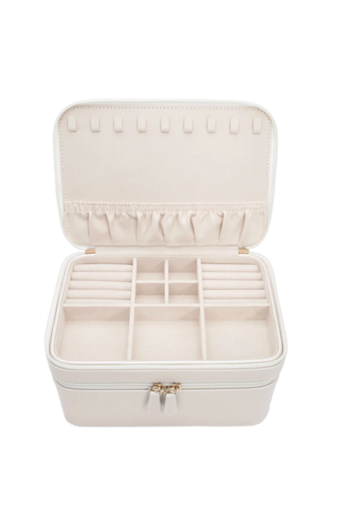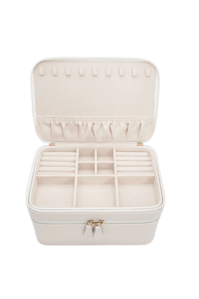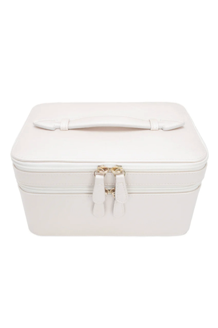 Traveling with jewelry and cosmetics has never been easier than with the Abby Jewelry & Cosmetic Case. This sleek and stylish case is made from premium vegan leather and flannel interior for your jewelry, so you know your items will stay safe and secure. The upper compartment holds nine hooks with a separate compartment for necklaces, 8 ring slots, 4 small open compartments and 3 large open compartments. When it’s time to pack up your cosmetics, simply open the lower section that features three pouch compartments for any of your small items.