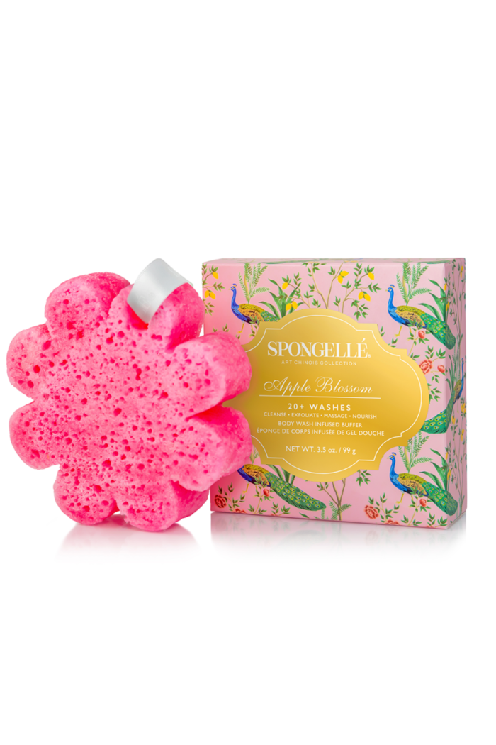 A luxe exfoliating sponge scented with apple blossom, designed to cleanse and buff the skin. The Apple Blossom Art Chinois Body Buffer holds infused body wash to lather, exfoliate and lightly massage in the shower. This item is from Spongelle and pairs decorative packaging with a soft, porous sponge for daily pamperingApple BlossomEmpty heading