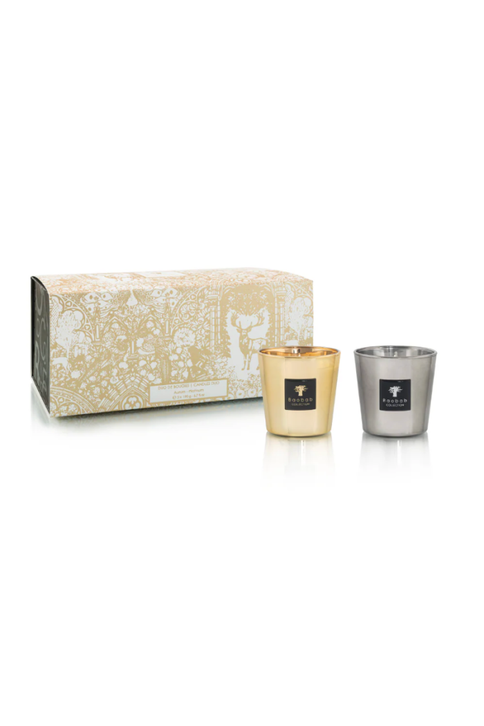 Aurum & Platinum Les Exclusives Candle Duo is a pair of votive candles presented in a decorative gift box. The set includes a gold-finished and a silver-finished vessel, each bearing the Baobab Collection emblem. These fragranced candles are styled as a luxe tabletop accent or thoughtful gift for home scenting.