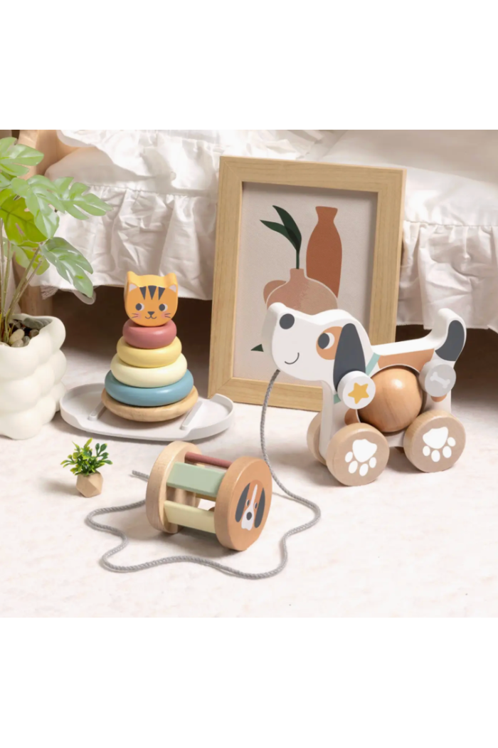 A gentle wooden play set designed to introduce little ones to shape, color, and cause-and-effect. The Baby Sensory Play Set - Puppy includes a pull-along dog, stacking rings, and a rolling rattle to engage tactile and visual development. Crafted from smooth painted wood with soft, muted colors, this set is ideal for supervised floor play and early motor skill practice. The set is made by TOKIPLAY and blends classic toy construction with modern nursery-friendly design.