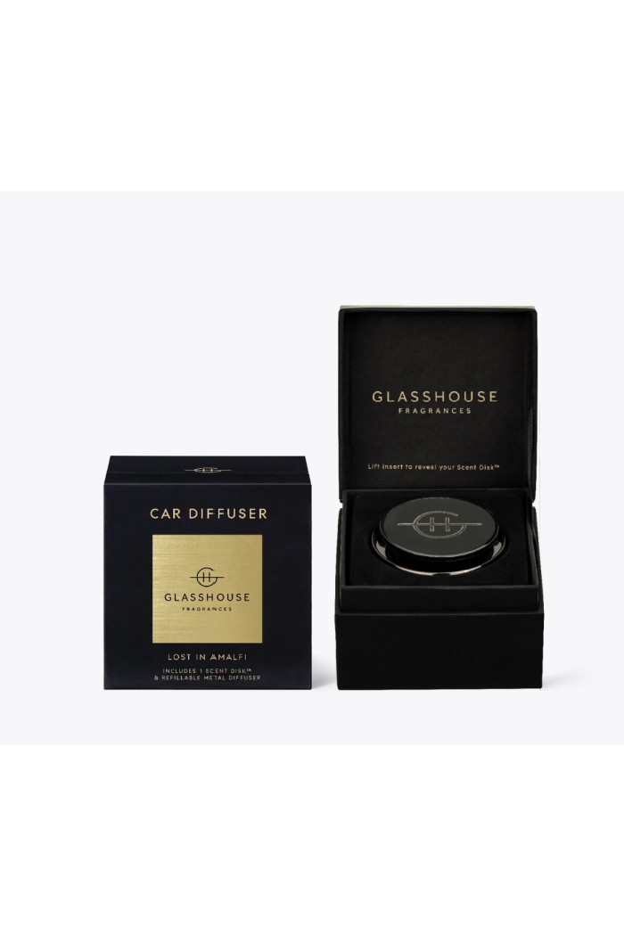 A sleek metal car diffuser scented with the Lost in Amalfi fragrance for on-the-go freshness. The Black Car Diffuser — Lost in Amalfi comes in a refillable metal case and includes a scent disk for easy installation. Glasshouse Fragrances designed this compact diffuser to clip discreetly in your vehicle while delivering a long-lasting aromatic experience. Its polished black finish makes it a refined gift item or personal accessory for daily drives.
