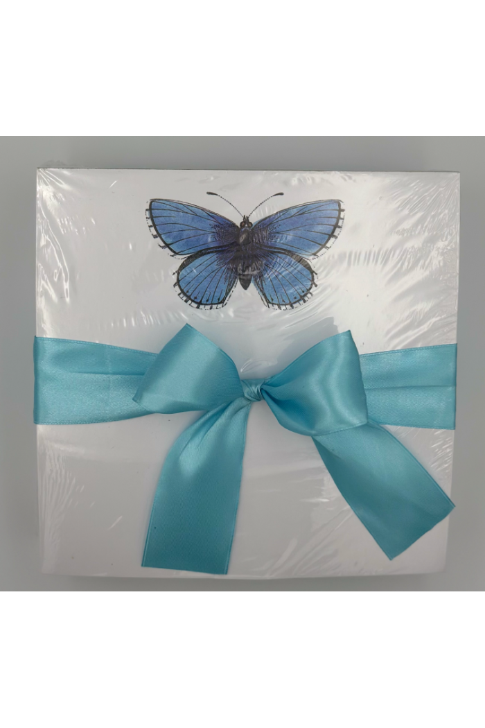 A pretty notepad topped with a hand-drawn blue butterfly and finished with a satin turquoise ribbon tied in a bow. The Blue Butterfly Notepad is offered by SAINT AUSTIN COMPANY and presents a neat stack of stationery perfect for everyday notes and lists. Thoughtfully packaged, it makes an easy, decorative gift or a cheerful desktop accent.
