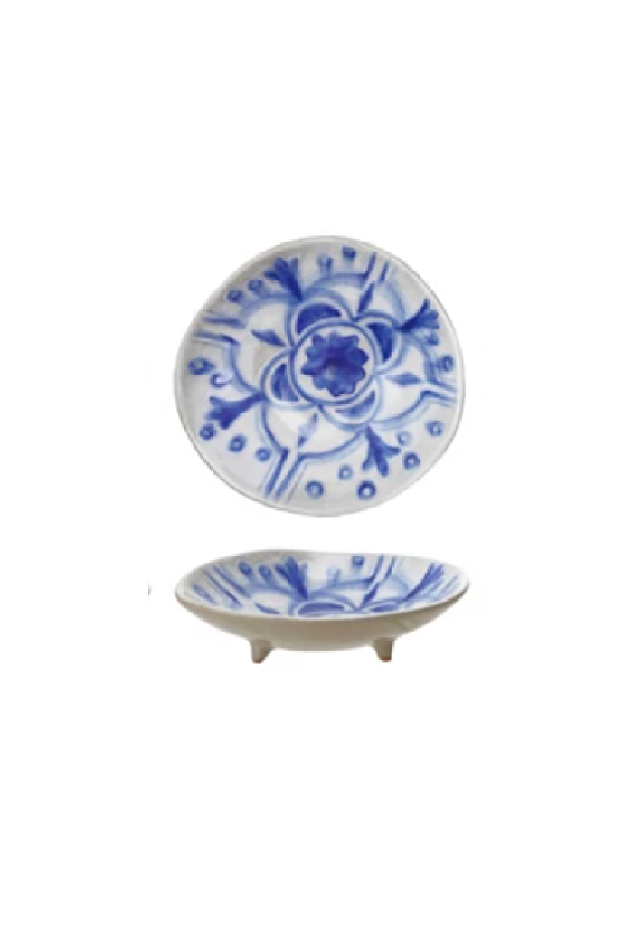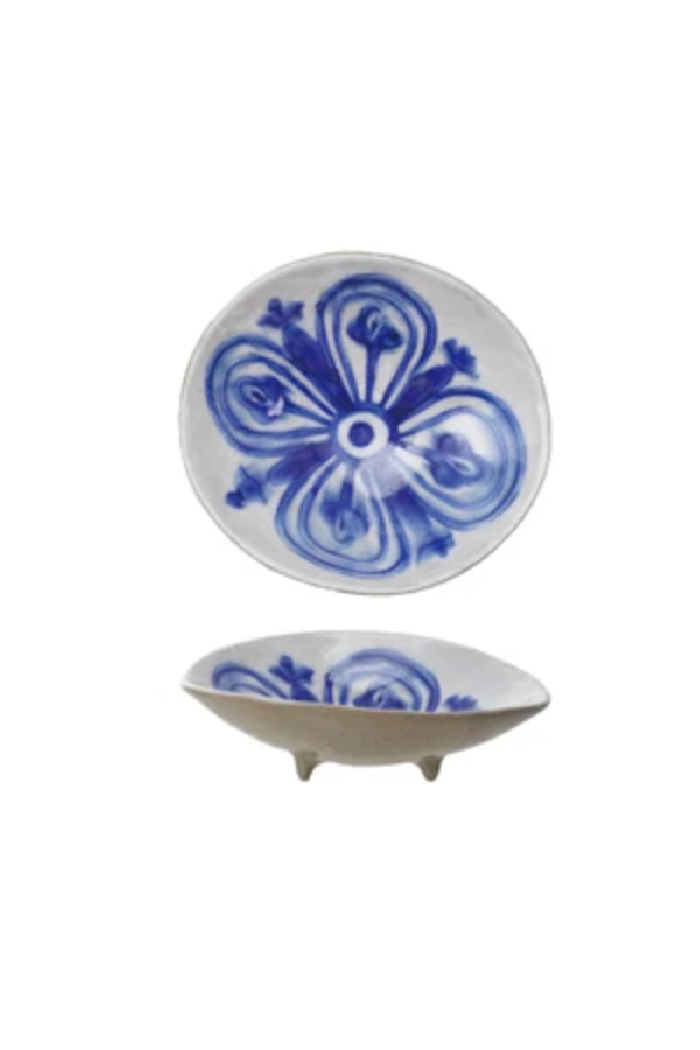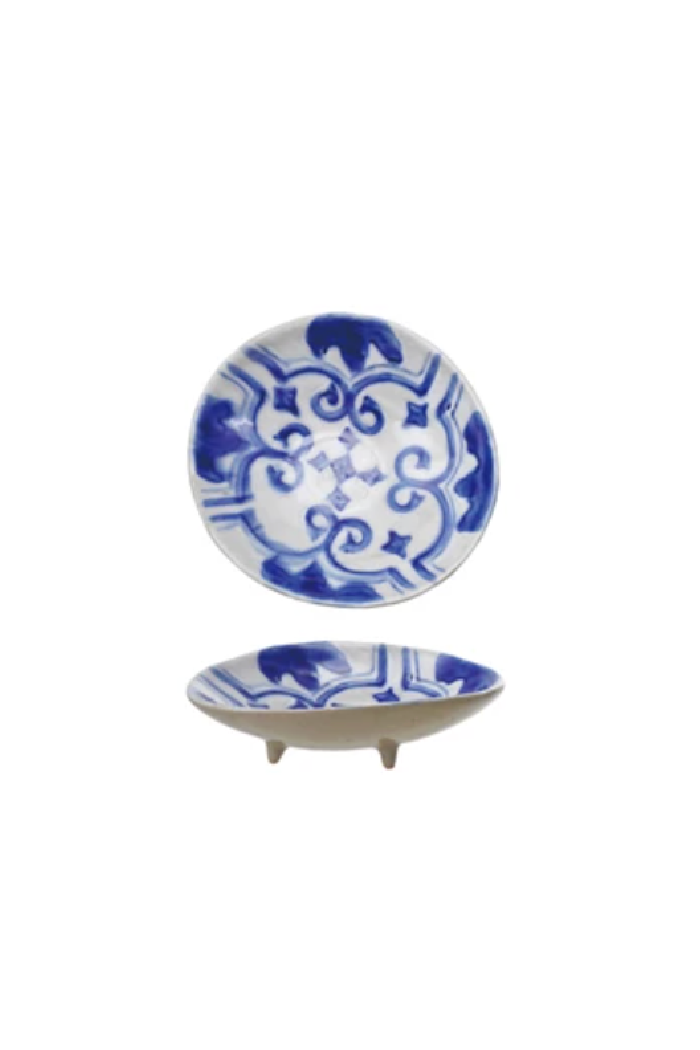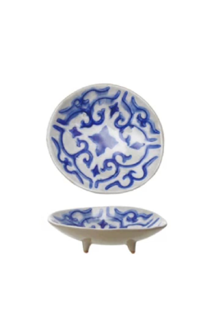 5-1/4" Round Hand-Painted Stoneware Footed Dish w/ Pattern, Crackle Glaze, Blue & White, 4 Styles (Each One Will Vary)