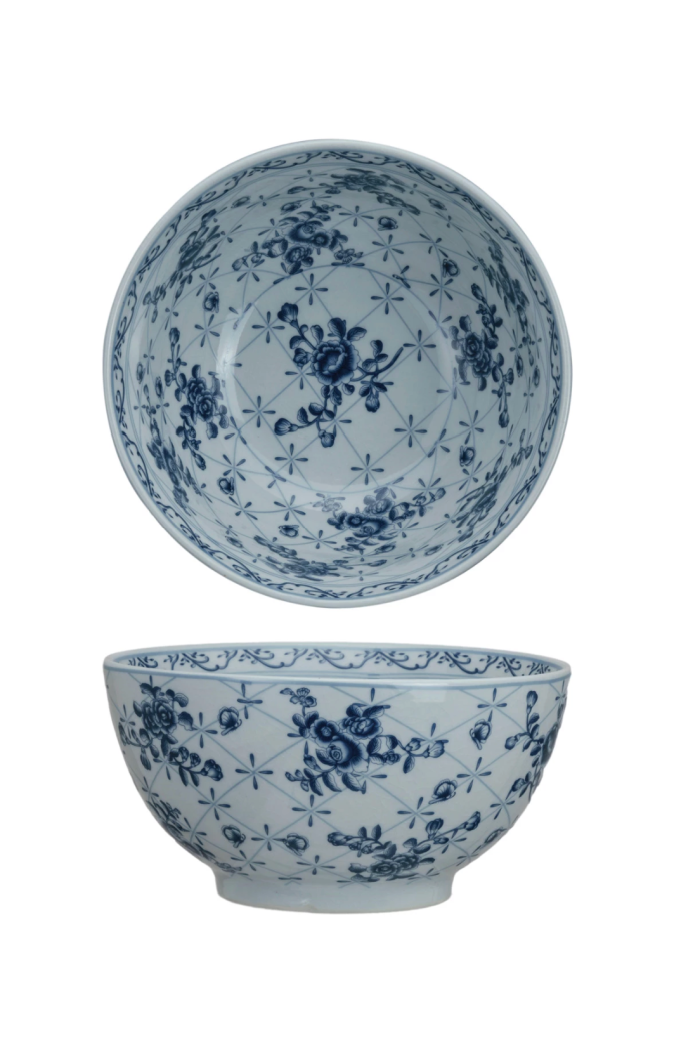 A classic blue-and-white floral ceramic bowl with delicate lattice and rose motifs. The Blue Floral Ceramic Bowl is glazed porcelain with a rounded silhouette and a small footed base, ideal for soups, rice, or cereal. Its timeless pattern and compact size make it a versatile addition to everyday table settings or layered place settings for special occasions.