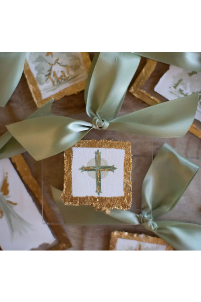 Each “The Cross" ornament is hand painted in watercolor with gold leaf details upon an acrylic base.