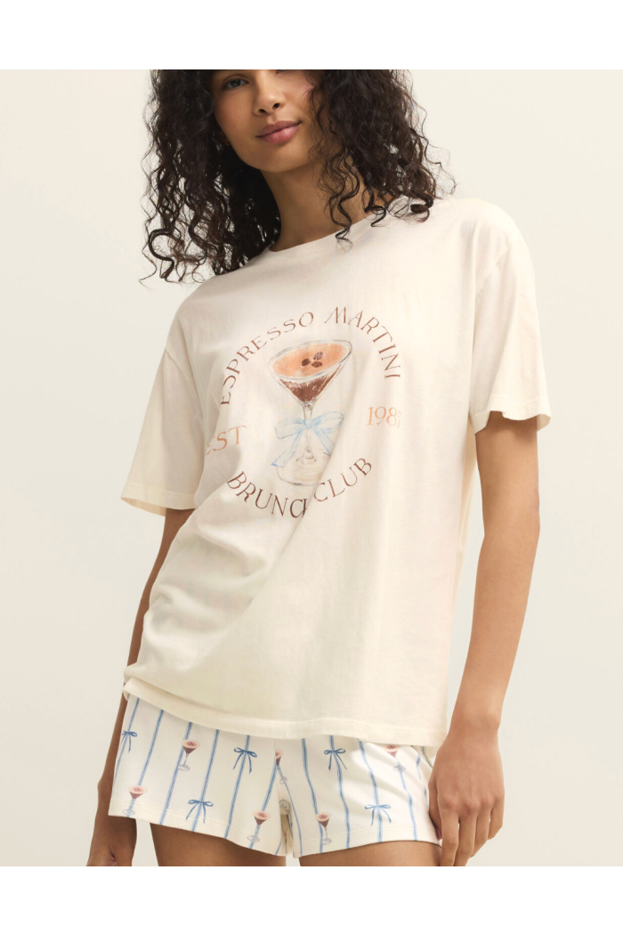 The ESPRESSO MARTINI BOYFRIEND TEE is a relaxed, graphic tee with a soft crew neckline and short sleeves. The vintage-style cocktail print and slightly boxy silhouette make it an easy weekend staple for lounging or casual outings. It pairs effortlessly with pajama shorts or denim for a laid-back brunch look.