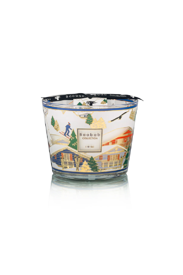 Plunge into the heart of the snowy peaks with the new edition of the I Love Ski candle, an elegant ode to the alpine world. Its refined glass is enhanced by a silk-screen print in gold and bright colors, illustrating charming mountain chalets nestled in a wintry landscape. It’s fun to watch the little skiers on the glass, the golden fir trees, and the chairlift that seems to come alive under the light of the flame.
