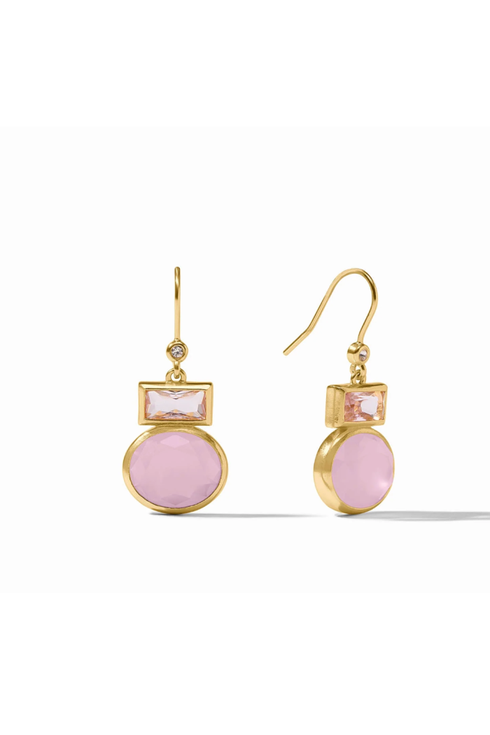 A pair of gold-tone drop earrings set with faceted rose-pink stones for a luminous, feminine look. The Jolie Midi Earring — Rose features rectangular and round gem drops suspended from classic French hooks for gentle movement. Julie Vos designed these lightweight, statement earrings to add color and polish to both daytime and evening outfits.