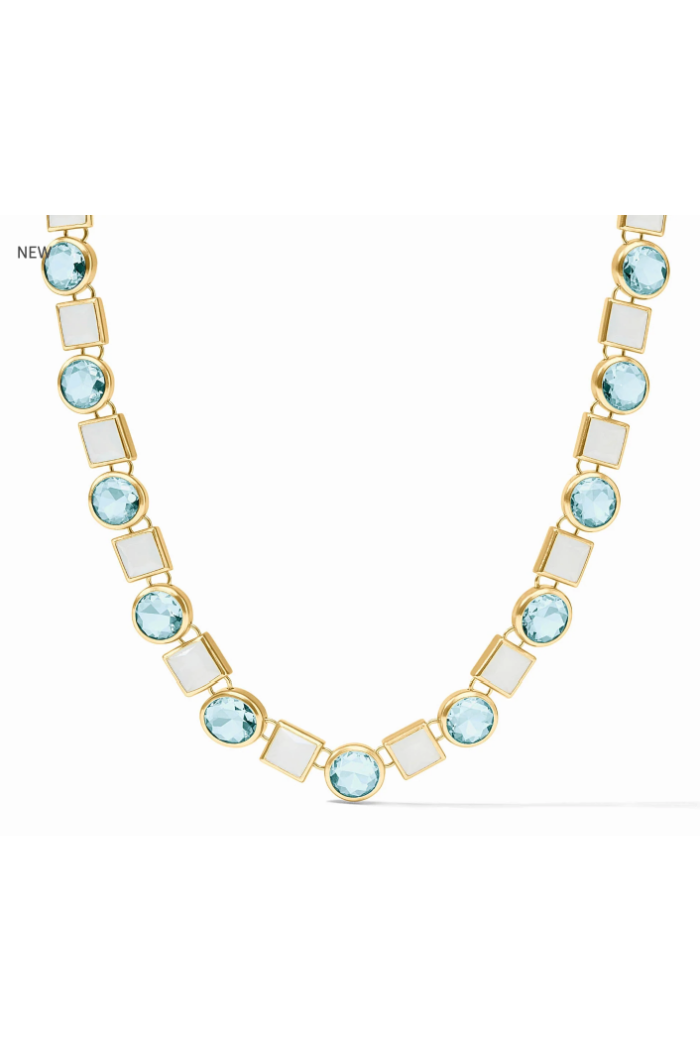 A bold, gemstone-studded tennis necklace that pairs luminous aqua stones with square mother-of-pearl links for a modern, polished look. The JOLIE TENNIS NECKLACE sits close to the collarbone and makes a standout statement layered over evening or elevated daytime outfits. This piece is designed and finished by Julie Vos with gold-tone metal settings that highlight the color contrast and faceted sparkle.