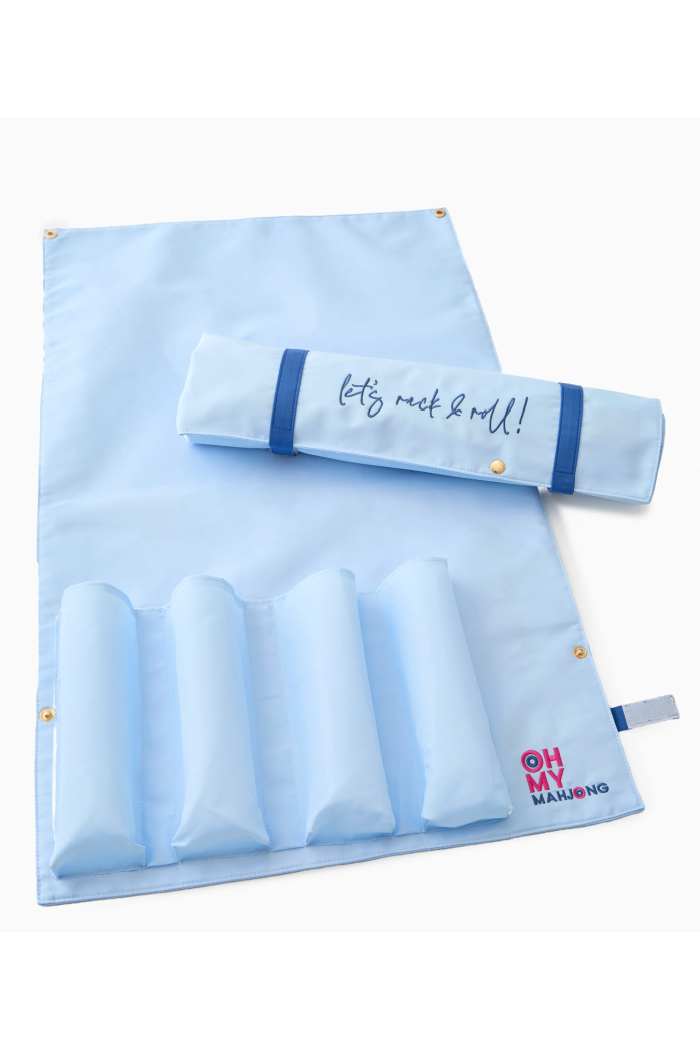 A light-blue roll-up mahjong tile rack designed for storage and travel. The LIGHT BLUE LET'S RACK & ROLL mahjong tile rack features five padded pockets, snap closures and a strap that rolls up for compact carrying. OH MY MAHJONG blends playful printed lettering with a wipeable, structured fabric for easy cleanup and on-the-go gameplay.