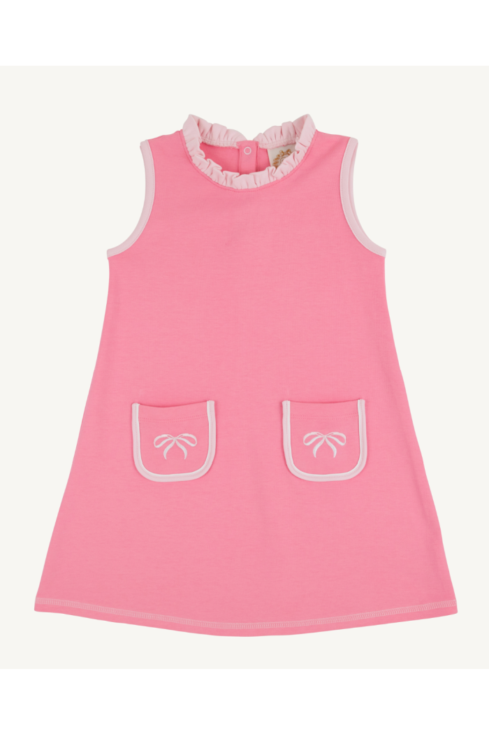 The Lizzie Luxe Leisure Dress - Ruffle Romany Rose is a sleeveless, A-line girls' dress in a rosy pink knit with a ruffled neckline and contrast trimmed patch pockets. The Beaufort Bonnet Company offers this playful silhouette that balances comfort with classic sweet details. It's ideal for everyday wear or special casual occasions where easy movement and charming touches matter.