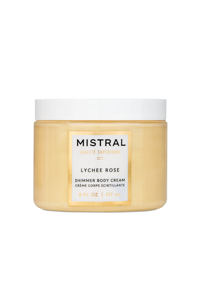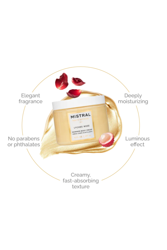 Lychee Rose Luxe Shimmer Body Cream is a lightweight, shimmer-infused moisturizer that delivers subtle glow and lasting hydration. Mistral Soap blends lychee and rose notes in a glossy golden formula presented in a 6 fl oz jar. Apply after shower to smooth skin and leave a soft, luminous finish for day or evening wear.