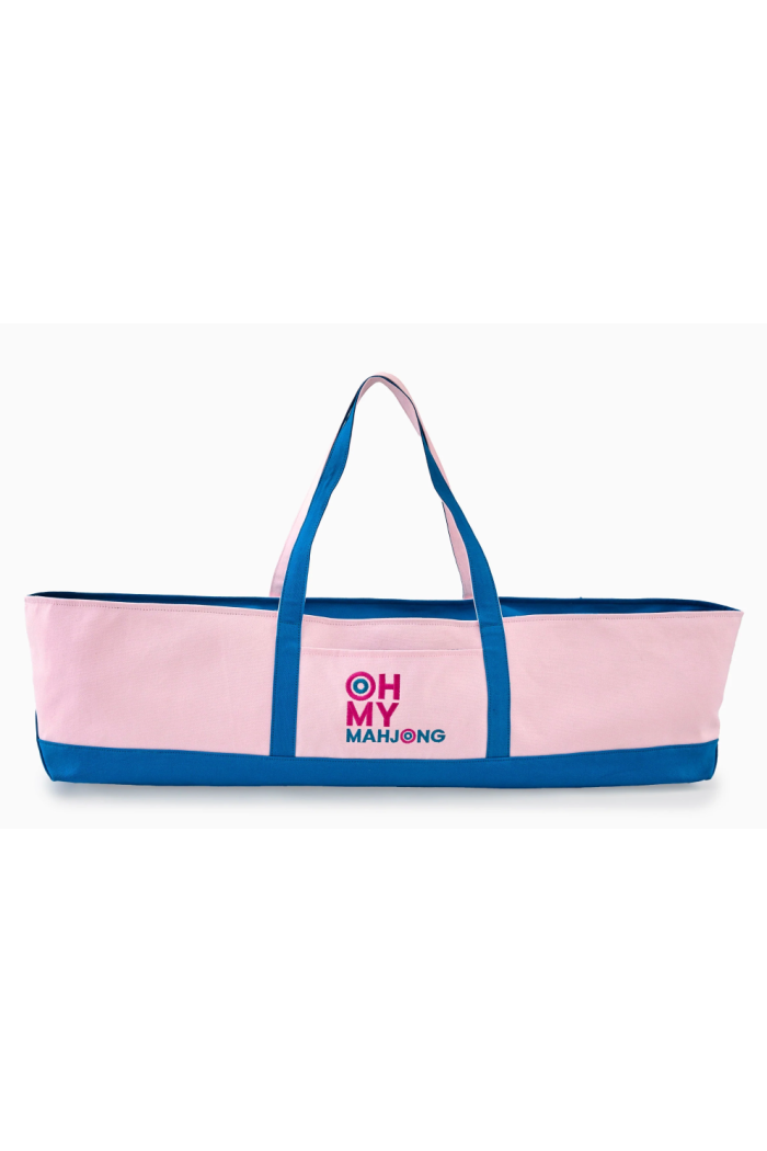 Keep your play or yoga mat neatly stored and easy to carry with this Mat Storage Bag. The long rectangular silhouette and dual shoulder straps are sized for rolled mats and feature a contrast blue base and handles against a soft pink canvas body. A zip-top closure secures contents for transport and storage while the front pocket offers quick-access space for small accessories. This thoughtful design is from OH MY MAHJONG and blends playful color with practical utility.