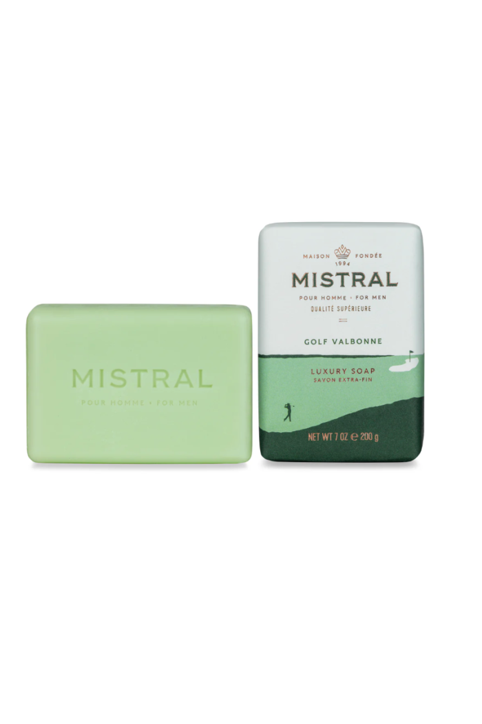 This Men's Bar Soap Golf Valbonne 7 oz is a luxury bath bar presented in a pale green soap and coordinating wrapped box. Mistral crafts the scented bar with a refined, subtly masculine fragrance and a smooth rectangular silhouette that's easy to hold. Ideal for gifting or daily use, the 7 oz size delivers long‑lasting lather and pairs well with other bath and scent items.