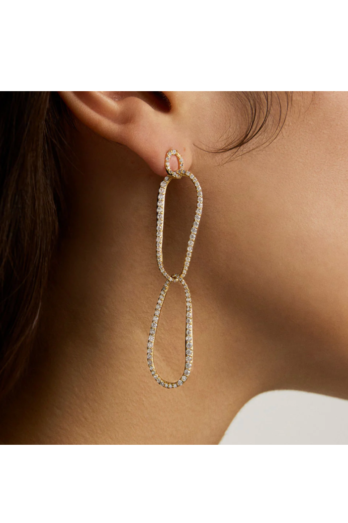 The Pave Camille Statement Drop Earrings are elongated double-loop drop earrings encrusted with pavé crystals for high-shine drama. They offer a lightweight silhouette that swings elegantly from the earlobe and pairs easily with eveningwear. These earrings are designed by DEAN DAVIDSON and showcase a luxe statement aesthetic with gold-tone metal and continuous crystal detailing.