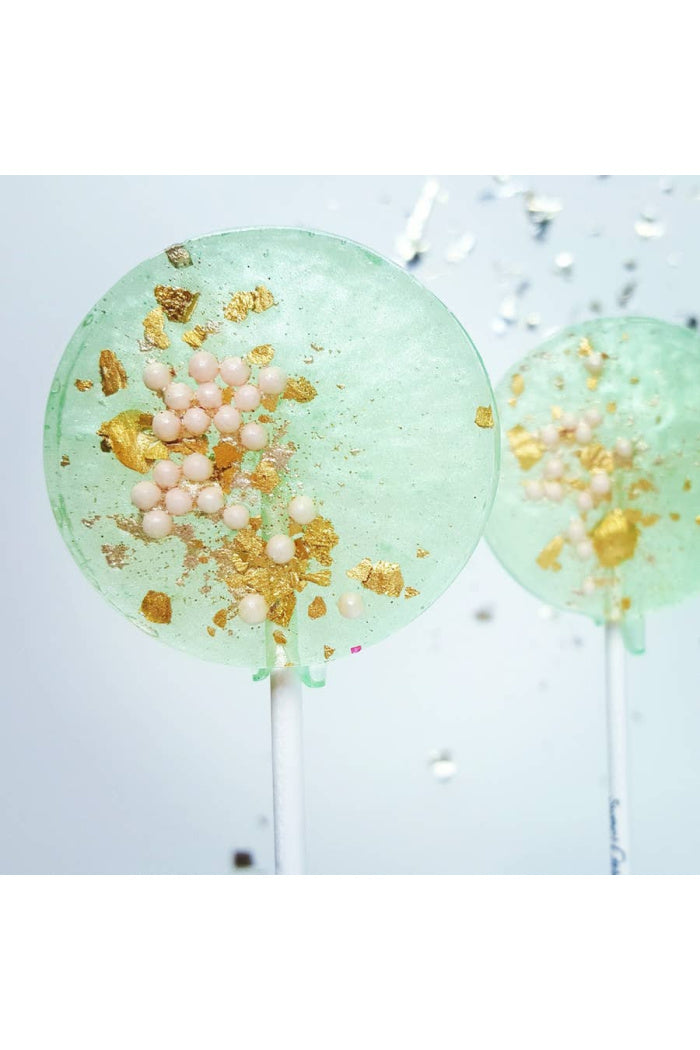 Our shimmery seafoam green candy with light pink pearlescent pearls + our handcrafted gold flakes with a touch of glitter. Each lollipop will be labeled with ingredient & allergen information. Dimensions: 2 1/4" in diameter Flavor: Pear Size: 1.3oz (36g) Branded Stick: 6" long, 5 /32" thick SHELF LIFE: 1 YEAR IN DRY CLIMATES