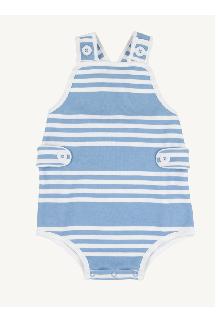 The Skipper Sunsuit in Saddle Ridge Stripe is a classic baby one-piece made for sunny days. This Beaufort Bonnet Company piece features soft knit fabric, button-strap shoulders and snap closures at the crotch for easy changes. Narrow white and sky-blue stripes with piped trim create a timeless nautical look perfect for warm-weather play. Lightweight and comfortable, it layers easily over a short-sleeve tee or stands alone for beach days.
