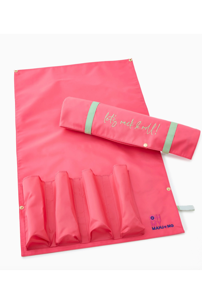 A bright roll-up play mat designed to organize and transport game racks and tiles. The Strawberry Let's Rack & Roll features multiple padded pockets, snap closures and mint-contrast straps for compact storage. It's crafted from a smooth, wipeable fabric in a vivid strawberry pink that lays flat for play. This playful accessory is from OH MY MAHJONG and is ideal for game nights or gifting to a mahjong lover.