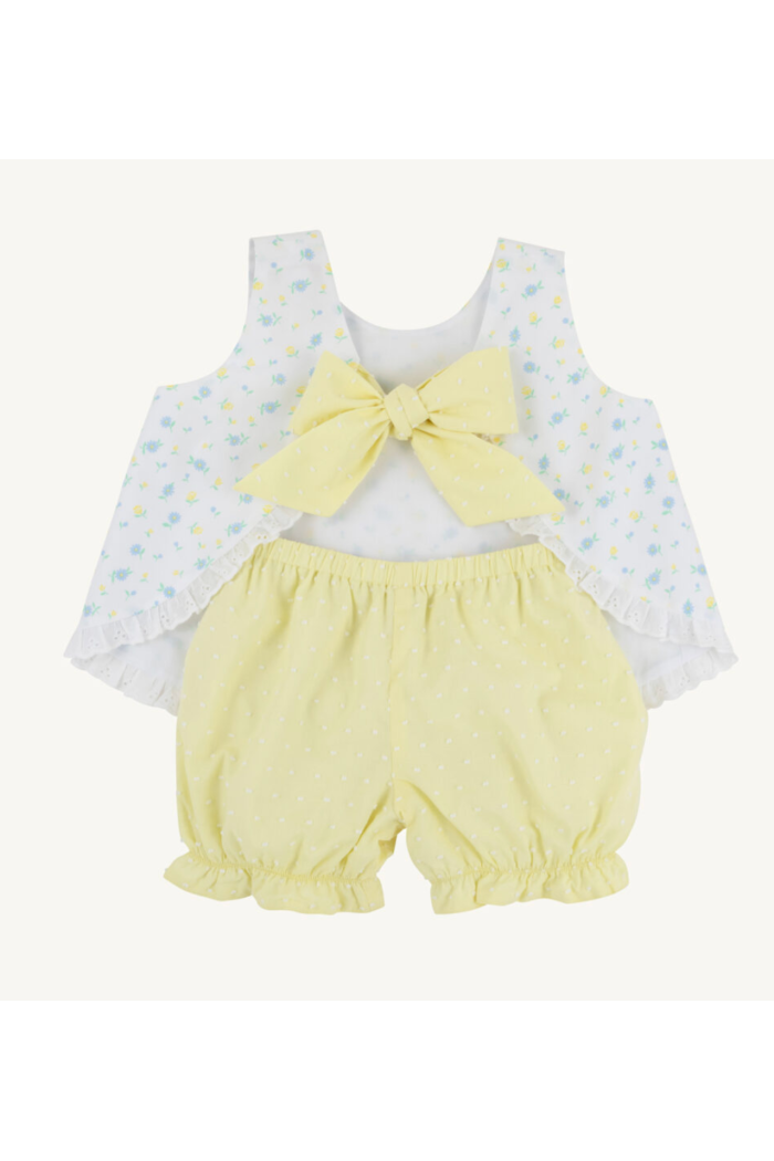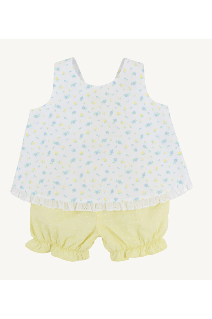 A breezy two-piece swing top set patterned in a delicate Dunwoody Daisy print. The Susie Swing Top Set features a sleeveless A-line top with eyelet ruffle trim and matching elasticized bloomers in a soft yellow dotted fabric. Lightweight cotton construction keeps the outfit cool and comfortable for warm-weather days. This charming set is offered by The Beaufort Bonnet Company and pairs classic Southern styling with easy baby-friendly details.