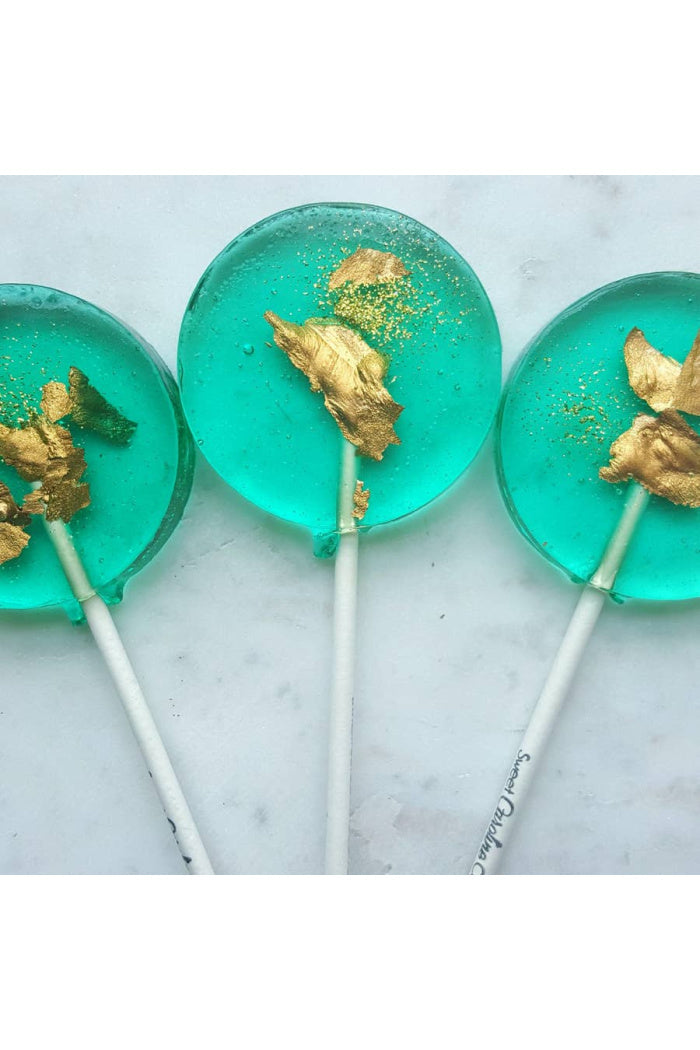 These pearly teal candy lollipops are each adorned with our handcrafted gold flakes and edible glitter. Each lollipop will be labeled with ingredient & allergen information. Dimensions: 2 1/4" in diameter Flavor: Green Apple Size: 1.3oz (36g) Branded Stick: 6" long, 5 /32" thick SHELF LIFE: 1 YEAR IN DRY CLIMATES
