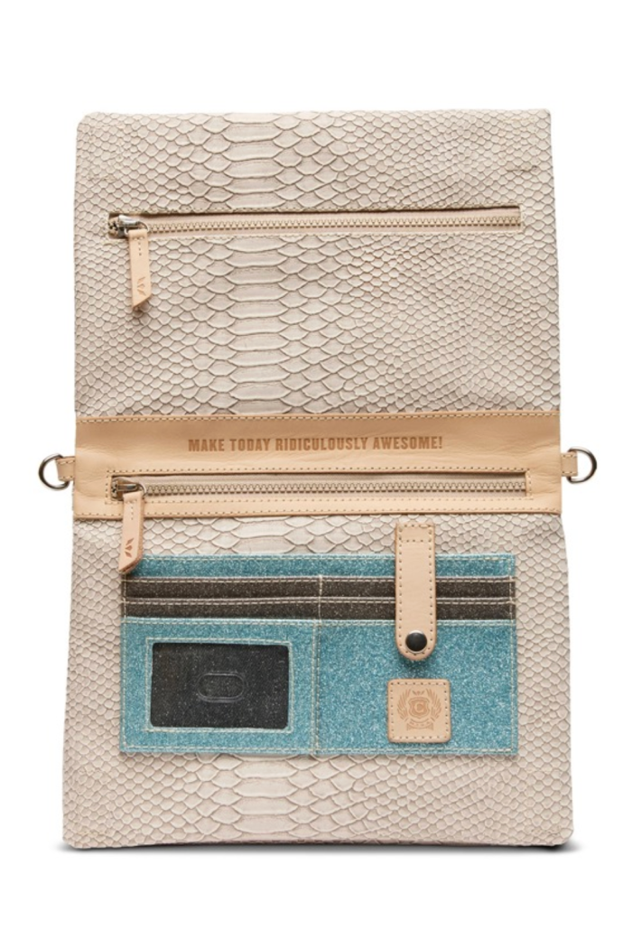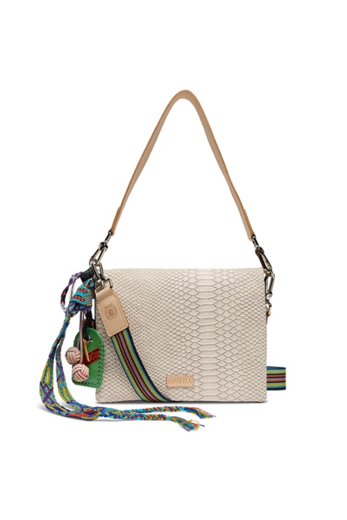 The THUNDERBIRD METRO CROSSBODY is a structured crossbody bag with a textured snakeskin finish and colorful detachable straps and tassel charms. Consuela crafts this piece from leather for a durable, hand-finished look. Its compact silhouette and adjustable strap make it perfect for running errands or weekend outings. The playful accents give it an off-duty vibe while still feeling polished enough for on-the-town plans.