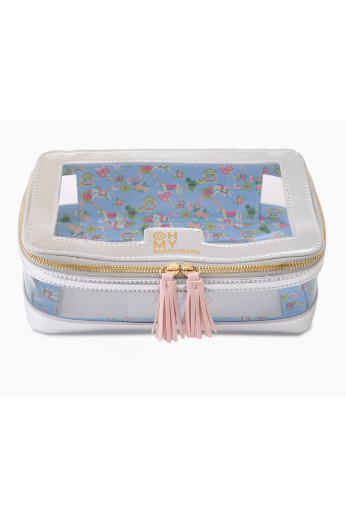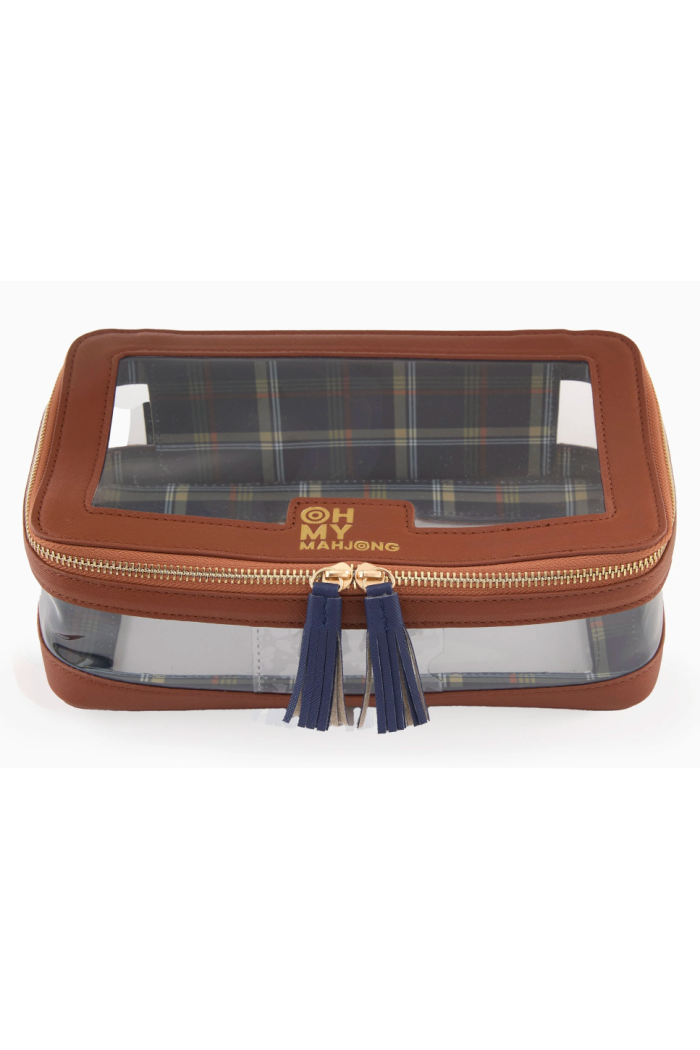 A compact Tile Storage Bag designed to keep game pieces organized and easy to access. The clear PVC window and zip-top closure reveal a patterned interior and make it simple to see contents at a glance. Trimmed in faux leather with gold hardware and tassel pulls, this case is both practical and decorative. The OH MY MAHJONG brand lends playful style while protecting and transporting your tiles securely.