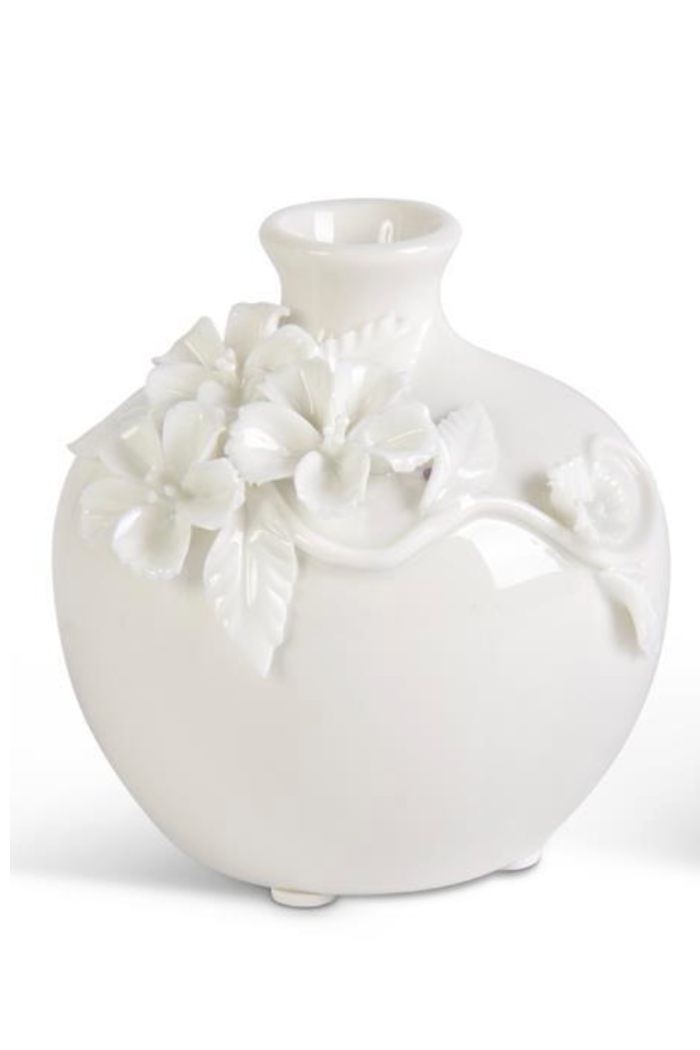 A sculptural ceramic bud vase detailed with a raised bouquet of flowers for a refined tabletop accent. The White Bud Vase with Bouquet of Raised Flowers has a glossy finish and delicate three-dimensional floral detailing that reads like porcelain relief. This decorative piece is offered by K&K Interiors and brings a subtle, elegant focal point to mantels, desks, or entry tables.