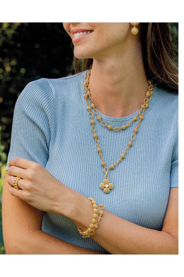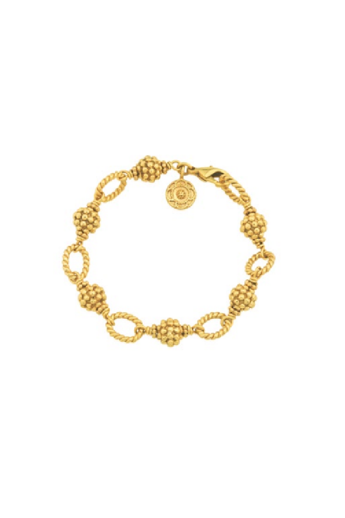 A gold-tone beaded bracelet with clustered berry motifs and textured oval links, offered in an adjustable 7" plus 2" extension. The Berry & Bead Bracelet features a lobster clasp and a small branded charm that catches the light for a refined finish. Capucine de Wulf designs this piece with feminine, vintage-inspired detailing perfect for everyday wear or special occasions.