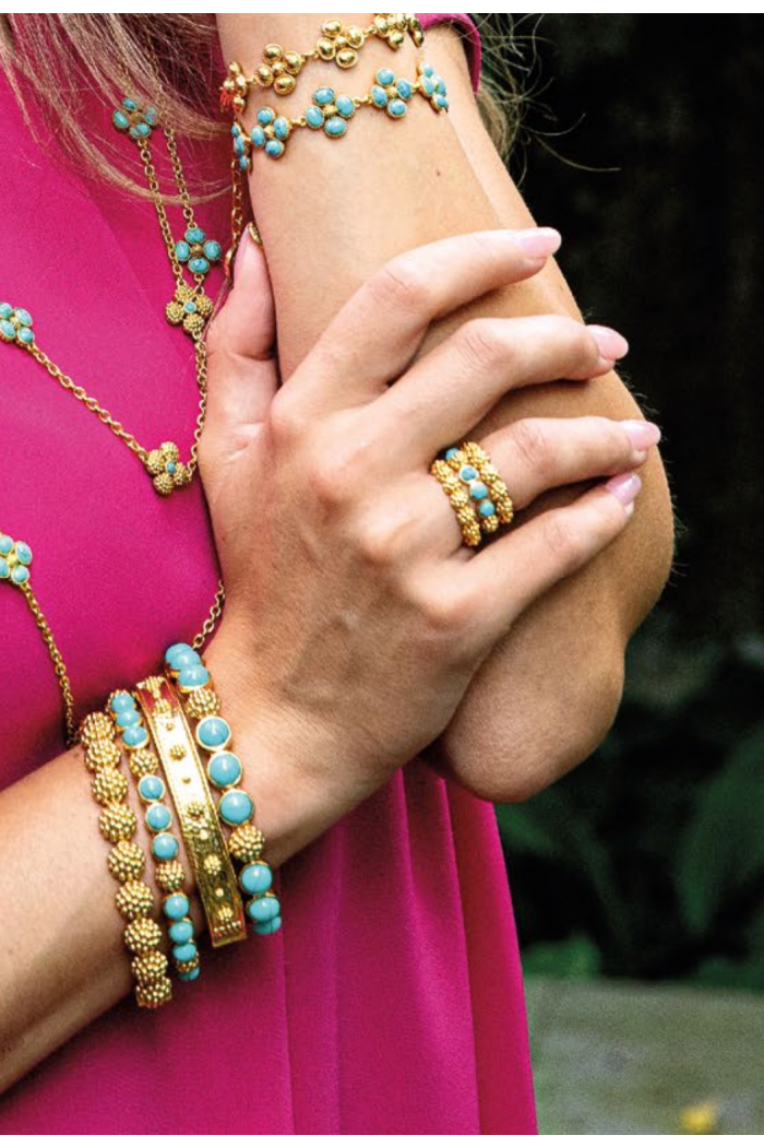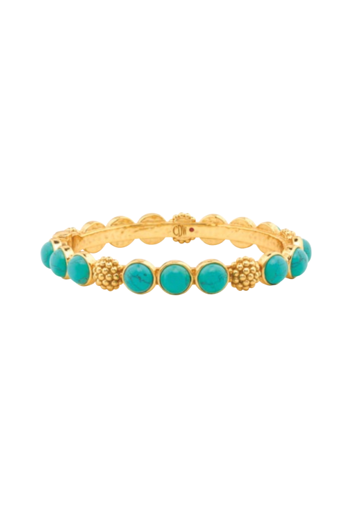 Trios of delectable, polished turquoise gem-drops are united by a sprinkling of golden berries to create this regal bangle that can elevate a pair of jeans or bring the perfect splash of glamour to your lucky business suit. Either way, it’s perfect for queening over your to-do list with exquisite style and grace. Stunning on its own, even better in a stack!